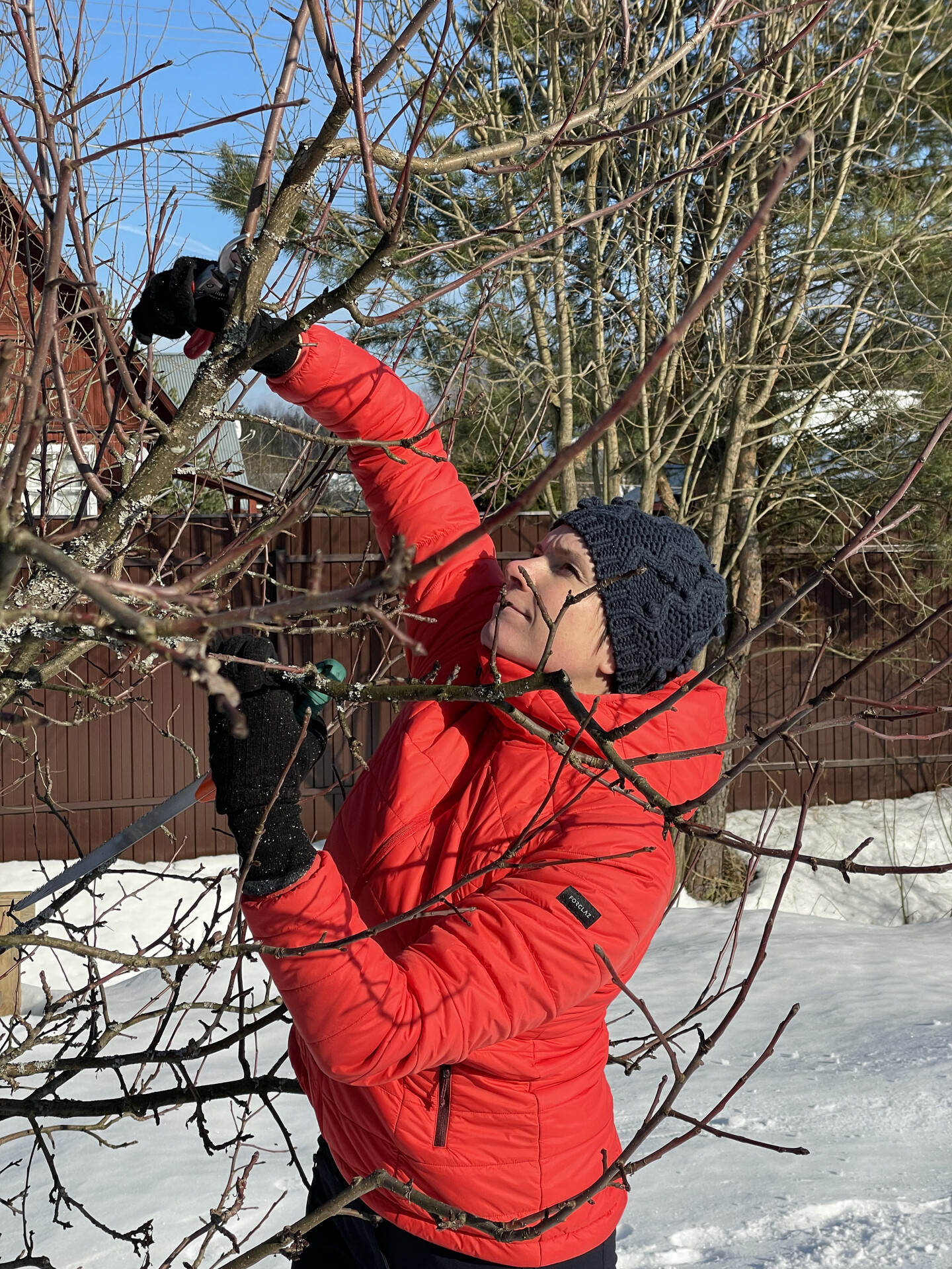 Весной включает в себя обрезку поломанных ветвей, подмерзших побегов, ветвей хвойных растений (туи, можжевельники), которые пострадали от выпревания под снегом.